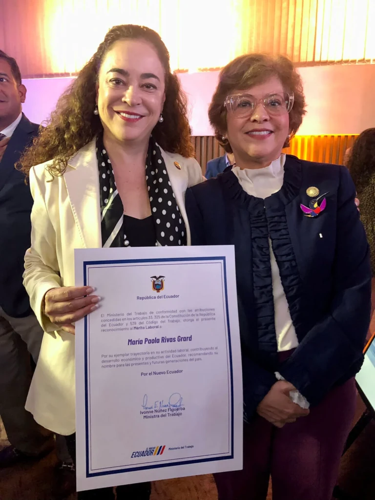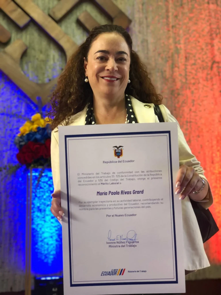 El Ministerio de Trabajo, a través de su máximo representante, la Ministra de Trabajo Dra. Ivonne Nuñez, reconocieron a los distintos sectores productivos, el diploma al mérito laboral por la ejemplar trayectoria y por contribuir al desarrollo económico y productico del Ecuador.
